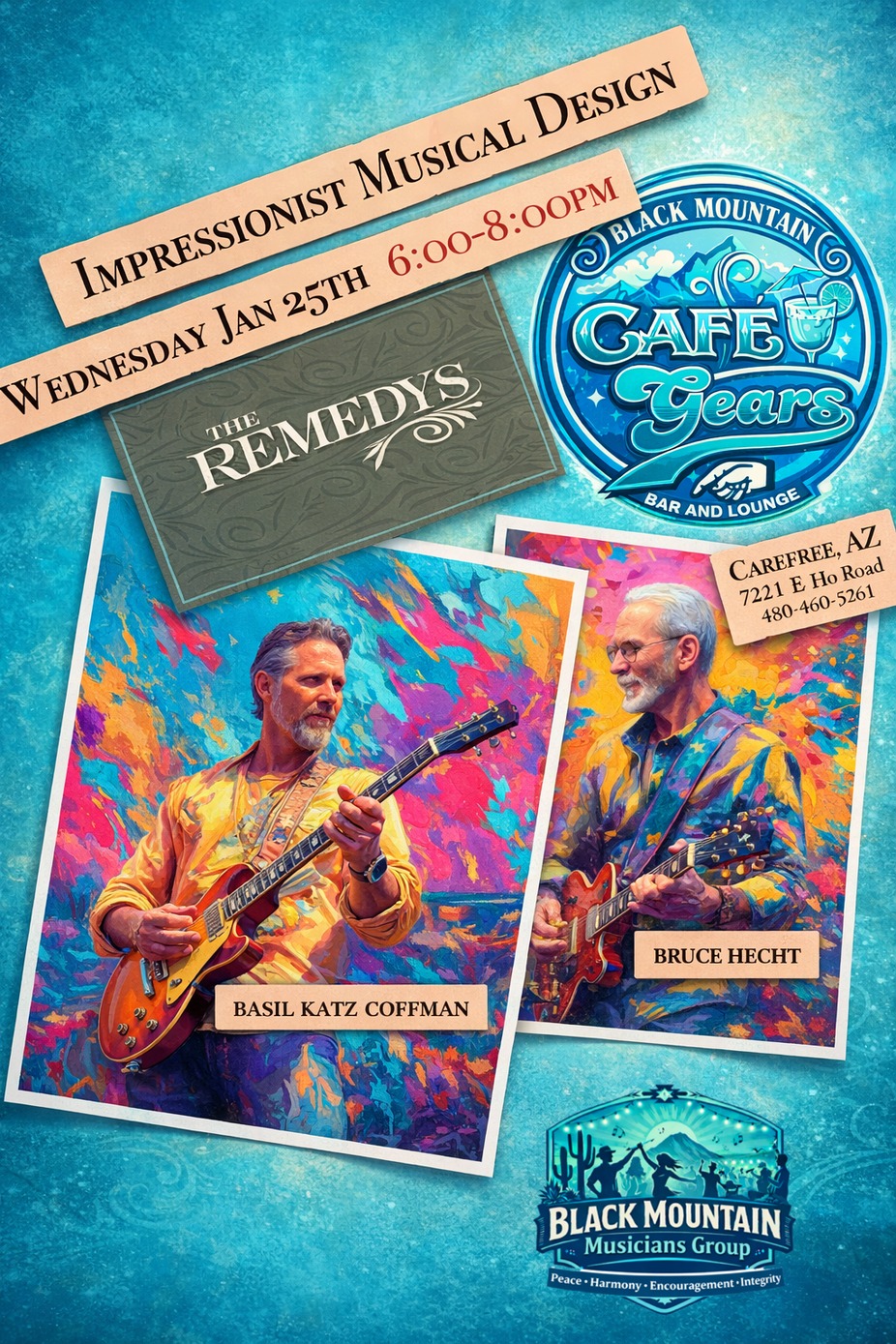 Bruce and Basil love Carefree, and they love playing their soft and sweet music for you. Listen while enjoying your dinner and wine, or other favorite drink. Come early for Groovy Hour specials, Plus it's ladies night with additional drink specials, plus $7 fgrozen margaritas on Tuesday, Wednesday and Thursday nights. Reserve your table 480-488-9261.