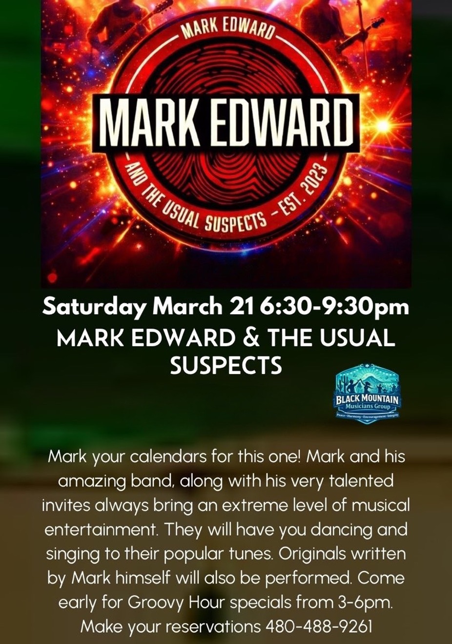 Saturday March 21st. Make your reservations for this amazing band. Always a favorite. Come early for Groovy Hour specials From 3-6 pm. 480-488-9261.