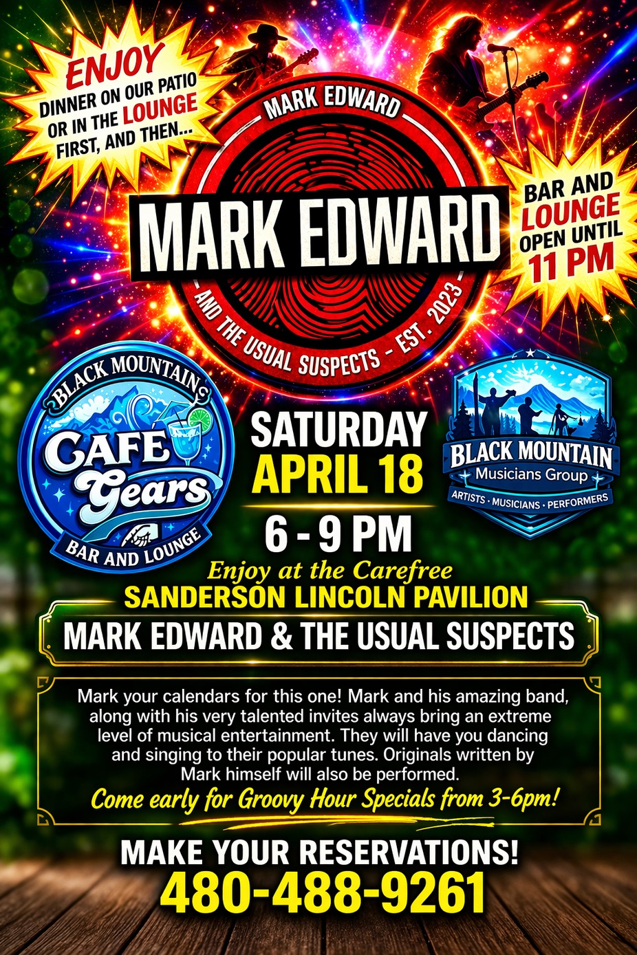 The man... The myth... The Mark! Mark Edward and his band, and a few friends will be entertaining you on this beautiful Saturday evening. Enjoy dinner and drinks first at the restaurant, and then head over to the Carefree Sanderson Lincoln Pavillion. You will hear a few amazing originals, and some great hits that you know and love. Come early for our Groovy Hour specials from 3-6pm. Groovy Hour specials resume back at the bar at 9pm until 11pm. WOOHOO! Reserve your table 480-488-9261